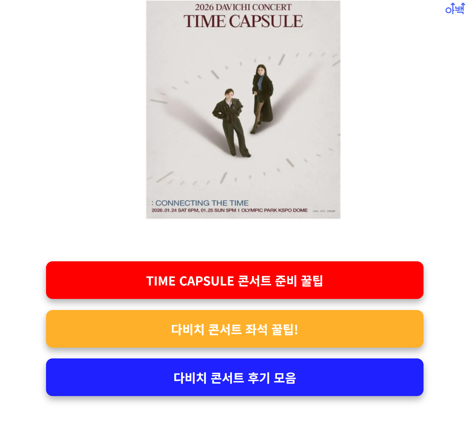 2026 다비치 콘서트 <TIME CAPSULE : 시간을 잇다> 예매를 앞두고 있다면, 가장 중요한 건 ‘좌석 선택’입니다. 좋은 자리는 감동이 배가 되고, 뷰가 아쉬운 자리는 집중력이 반감됩니다. 특히 KSPO DOME은 규모가 크기 때문에 좌석 구조를 미리 파악해야 티켓팅에 실패하지 않습니다.