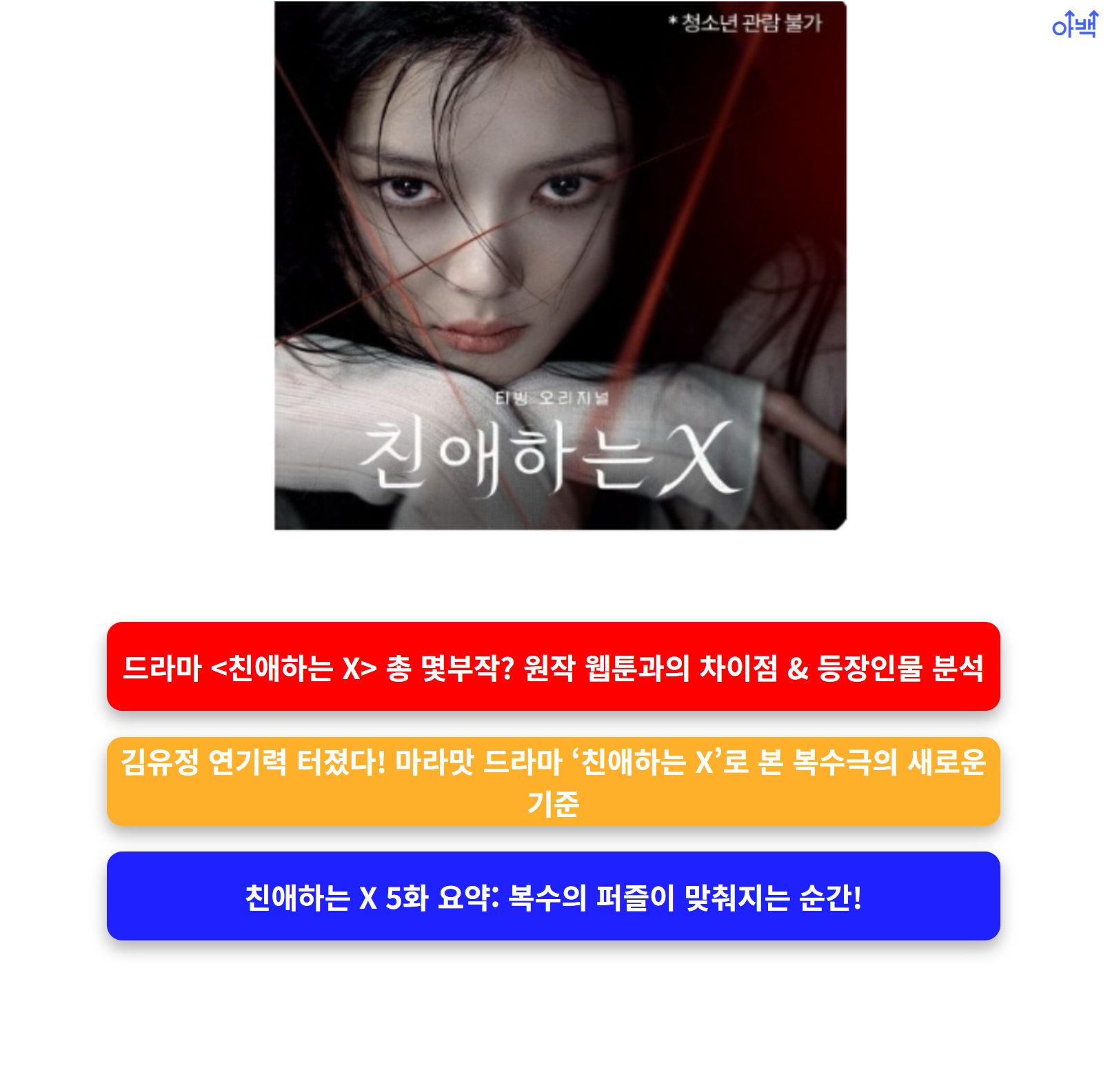 친애하는 X는 단순히 복수극이라기엔 너무 복잡하고, 단순히 미스터리라기엔 너무 강렬합니다. 윤준서, 백아진, 김재오, 백선규 — 이 네 인물을 중심으로 얽힌 진실은 회를 거듭할수록 충격과 반전을 동반하고 있습니다.