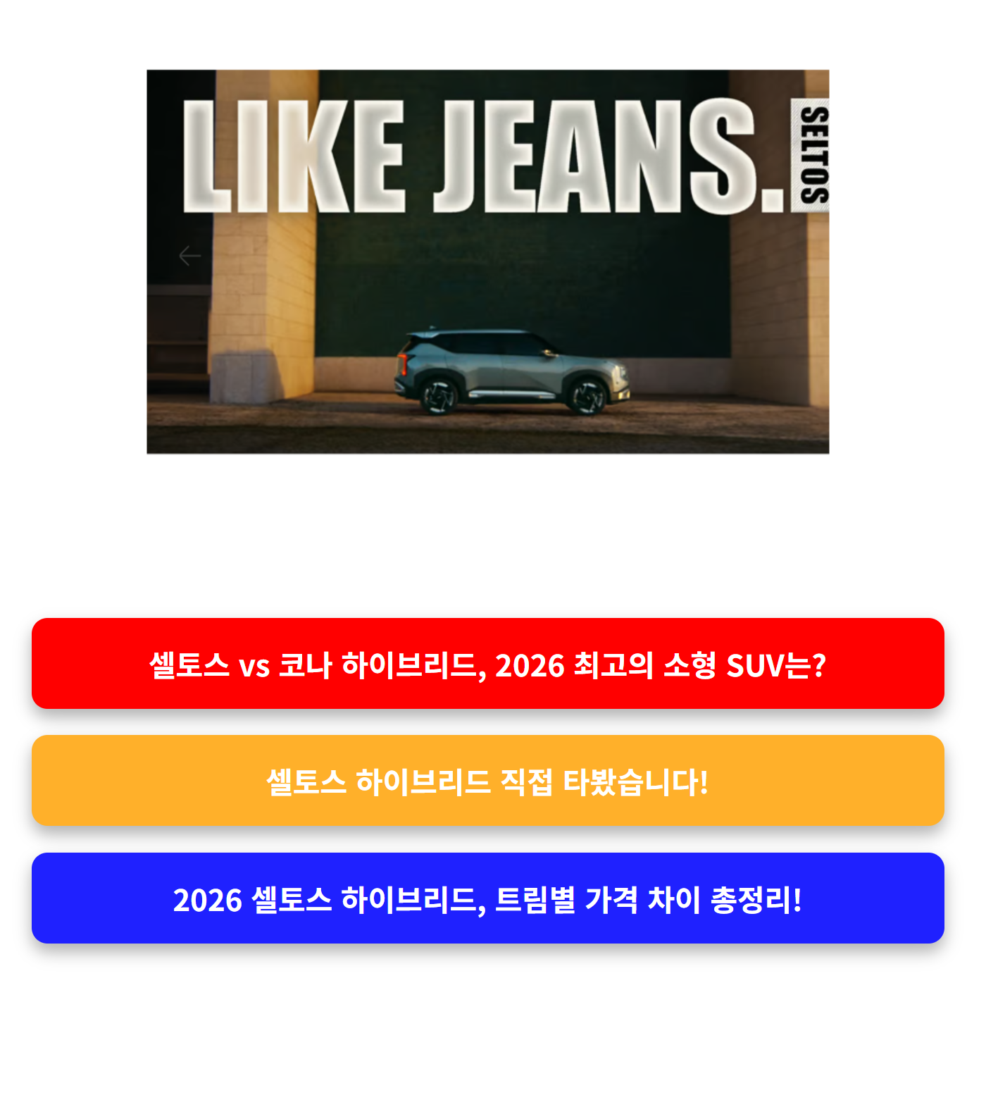 2026 셀토스는 공간, 기능, 안전, 브랜드 만족도까지 모두 챙긴 ‘전천후 SUV’입니다. 직접 비교해보고 나에게 맞는 차를 선택해보세요!